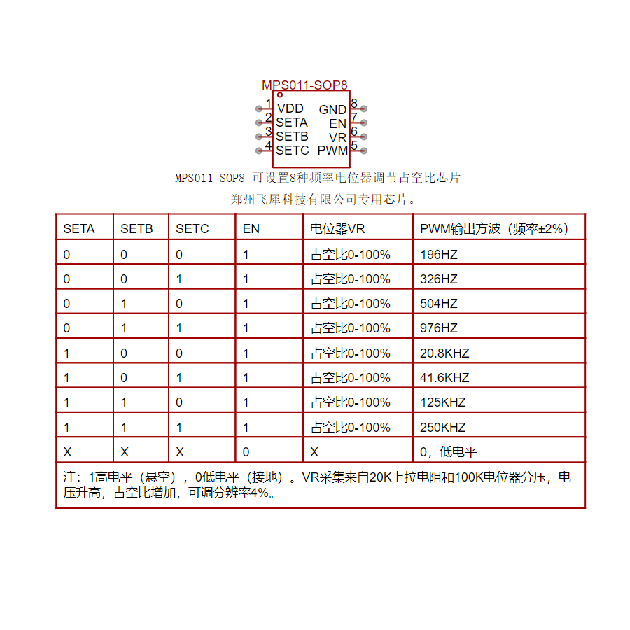 MPS011 SOP8 可设置8种频率电位器调节占空比PWM芯片 芯片供电,直流1.8-5.5V。  郑州飞犀科技有限公司企业淘宝店铺: MPS011 SOP8 可设置8种频率电位器调节占空比PWM芯片 [https://item.taobao.com/item.htm?id=973101614559&skuId=6091638139735](http://)